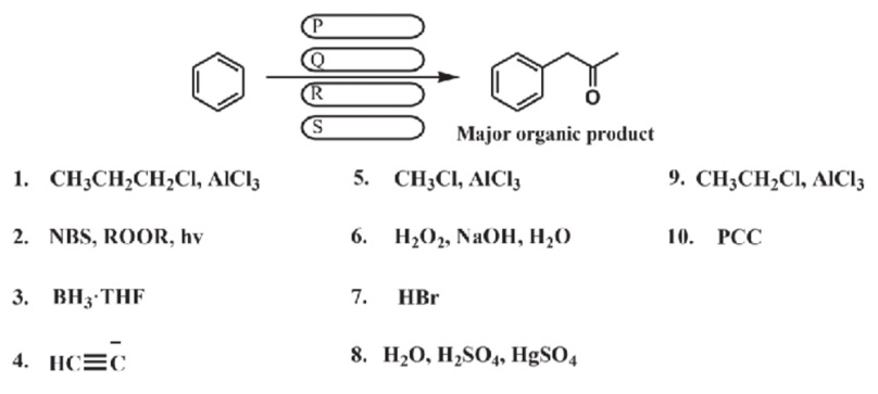 Choose the appropriate reagent sequence from the given reagents pool to complete the synthetic conversation. Make sure to use strictly four reagents, not more not less. Note: you can simply mention the numerical values corresponding to the reagents in the boxes P, Q, R, S, respectively and also consider major organic product in cach step.